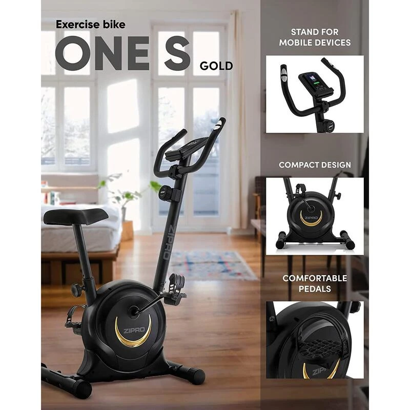 Compra en Decathlon Bicicleta estática magnética Zipro One S Gold La pantalla más grande mejora la legibilidad y el estante para dispositivos móviles le permite tener su teléfono inteligente a mano para estar en línea todo el tiempo.