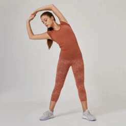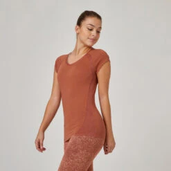 Camiseta Fitness Manga Corta Cuello Pico Algodón Extensible Slim Mujer Sepia