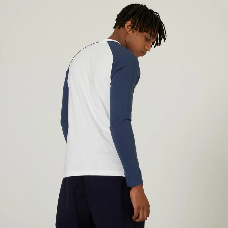 Camiseta Fitness Manga Larga Recta Algodón Hombre Domyos 520 Blanco Y Azul